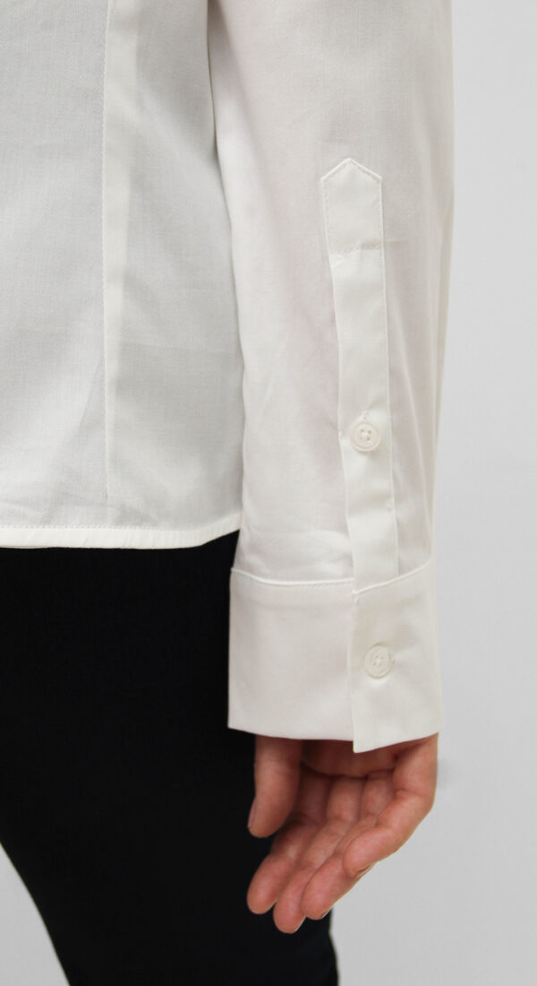 O colarinho em ponta e a carcela da manga alongada trazem um toque de modernidade e distinção ao modelo. As costas com recorte em pala adicionam um detalhe sutil, que valoriza a silhueta, sem perder a fluidez e o conforto. O tecido acetinado de toque macio, que valoriza discretamente esse modelo, oferece um visual sofisticado, ideal para aqueles momentos em que o conforto e a elegância precisam caminhar juntos. A camisa Olga é uma verdadeira tradução de funcionalidade refinada.