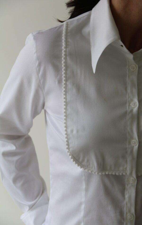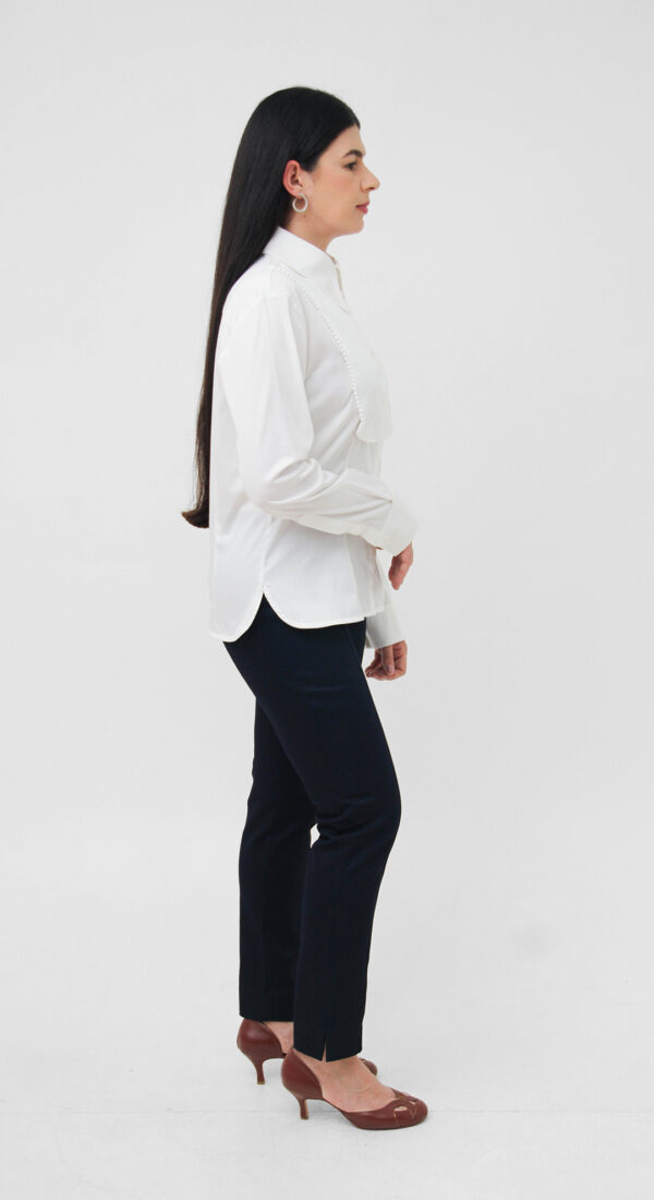 A camisa Olga, é a representação de alfaiataria funcional para pós-operatório e maternidade. Possui um design que combina elegância e praticidade, criando uma peça que se adapta perfeitamente às necessidades contemporâneas. O “peitilho” duplo, adornado pela passamanaria, além de adicionar um toque sofisticado, permite acesso à região do tórax de ambos os lados, sem a necessidade de utilizar o abotoamento frontal da camisa. Essa funcionalidade é essencial para momentos que exigem conforto e praticidade, como o pós-cirúrgico ou a amamentação, oferecendo a possibilidade de cuidados sem sacrificar a estética.